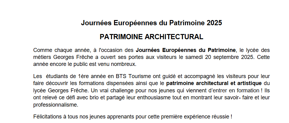 Comme chaque année, à l'occasion des Journées Européennes du Patrimoine, le lycée des métiers Georges Frêche a ouvert ses portes aux visiteurs le samedi 20 septembre 2025. Cette année encore le public est venu nombreux.