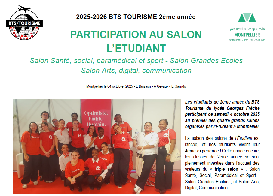 Les étudiants de 2ème année du BTS Tourisme du lycée Georges Frêche ont participé ce samedi 4 octobre au premiers des quatre grands salons organisés par L'Étudiant à Montpellier