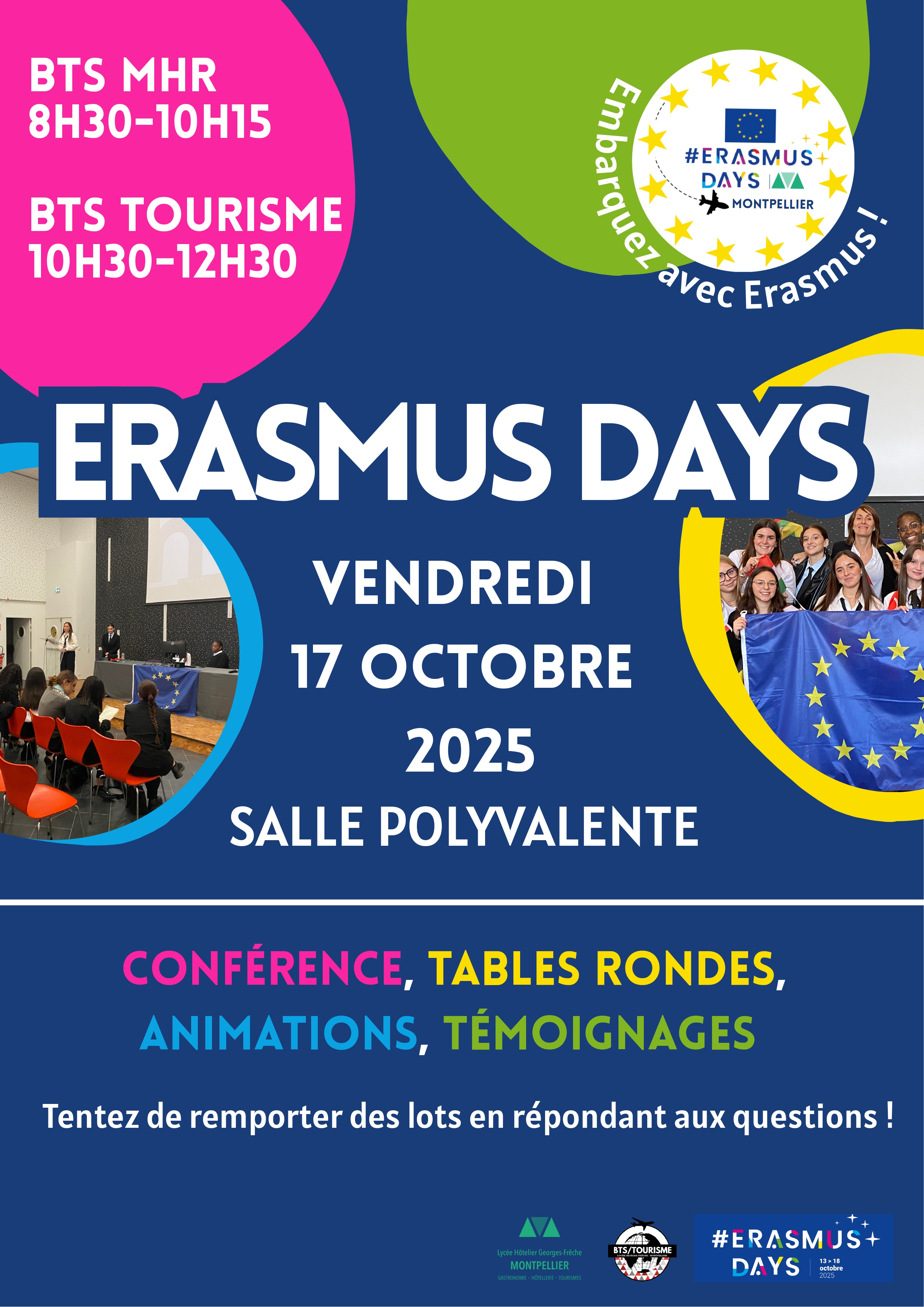 Chaque année, les étudiants de BTS Tourisme organisent les Erasmus Days pour le supérieur ! Conférence, témoignages, tables rondes... sont au programme !